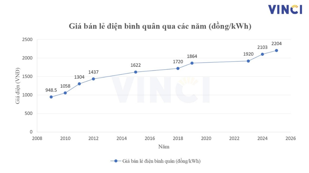 Biểu đồ thể hiện Giá bán lẻ điện bình quân qua các năm