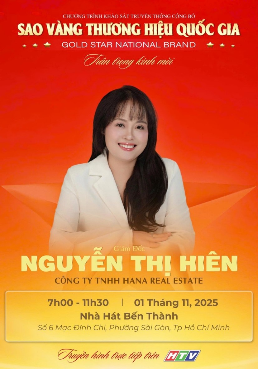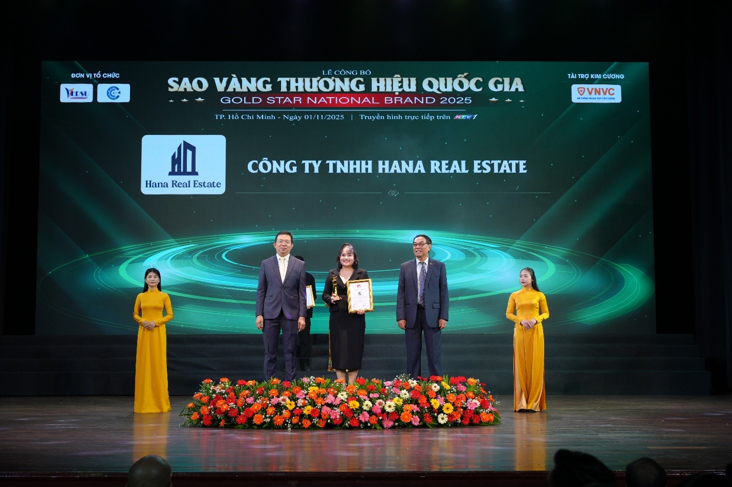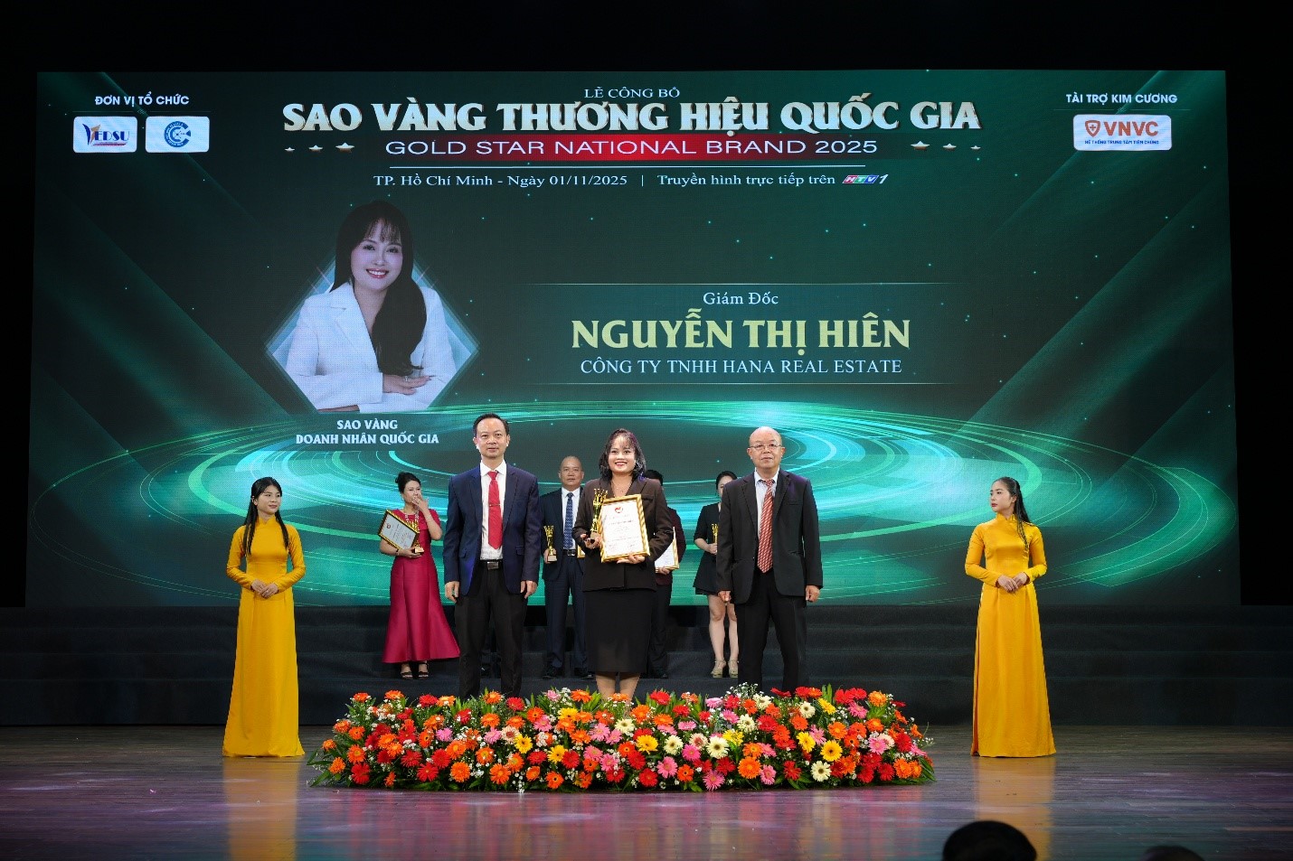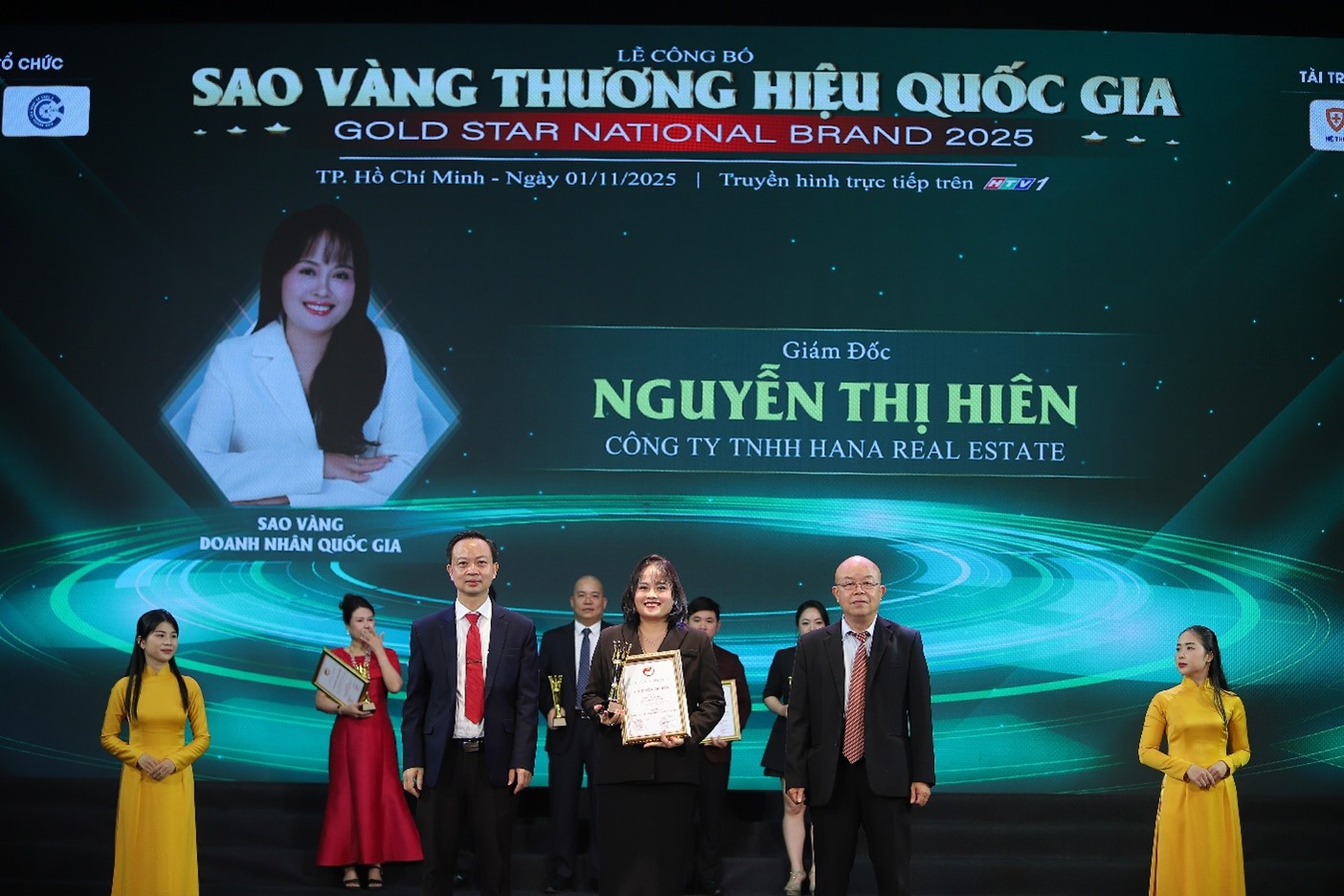 (Công ty TNHH Hana Real Estate và Giám đốc (Bà) Nguyễn Thị Hiên đã vinh dự nhận được cú đúp giải thưởng Sao Vàng Doanh Nghiệp Bất Động Sản Tiêu Biểu 2025 và Sao Vàng Doanh Nhân Quốc Gia 2025)