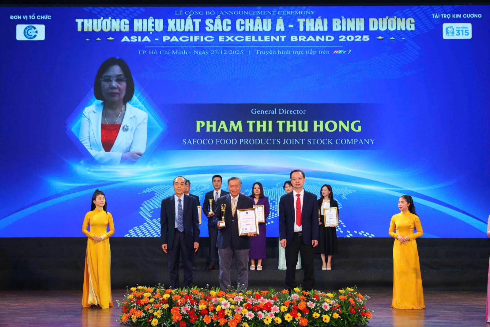 Với những đóng góp nổi bật trong công cuộc phát triển doanh nghiệp và nâng tầm thương hiệu Việt trên thị trường quốc tế, bà Phạm Thị Thu Hồng – Tổng Giám đốc Công ty Cổ phần Lương thực Thực phẩm Safoco đã vinh dự được trao chứng nhận “Nhà Lãnh đạo Xuất sắc Châu Á – Thái Bình Dương năm 2025”. Đây là một trong những giải thưởng uy tín nhằm tôn vinh các nhà lãnh đạo xuất sắc, bản lĩnh và có tầm ảnh hưởng tích cực trong khu vực.