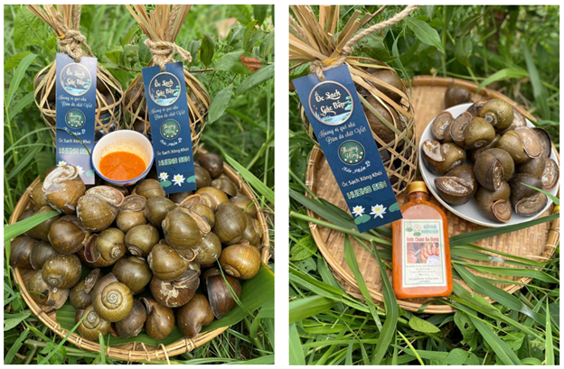 Từ tên gọi, bao bì đến cách chế biến, tất cả đều mang hơi thở Việt. Bao bì sản phẩm được thiết kế mộc mạc, lấy màu xanh và hồng làm chủ đạo, gợi cảm giác gần gũi như cánh đồng sen, nơi những chú ốc lớn lên mang đậm hồn quê Việt. Logo thương hiệu là hình con ốc nhỏ vươn mình đơn giản mà đong đầy ý nghĩa.