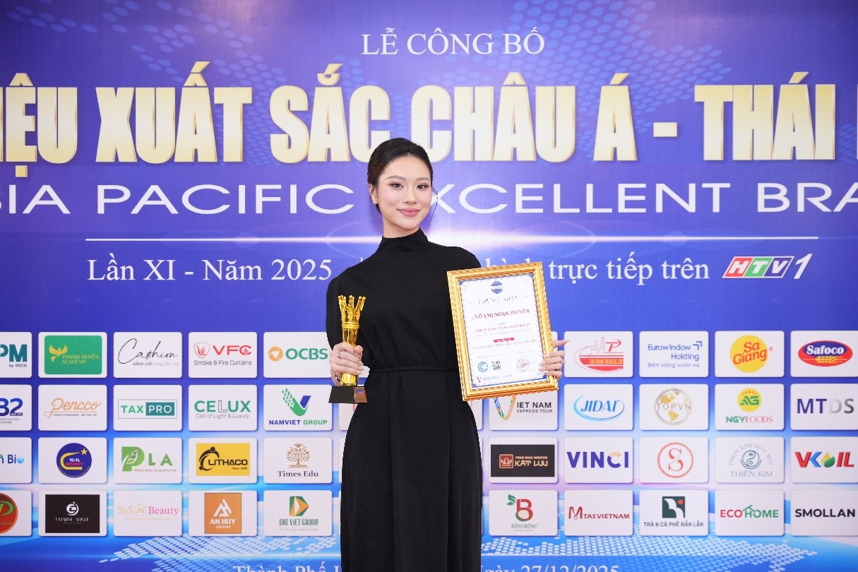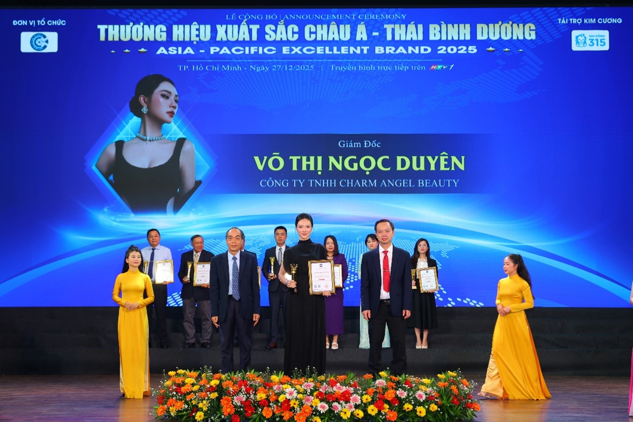 Mới đây, tại Lễ công bố và vinh danh Thương Hiệu Xuất Sắc Châu Á – Thái Bình Dương 2025, được truyền hình trực tiếp trên sóng HTV, bà Võ Thị Ngọc Duyên đã vinh dự được trao danh hiệu Doanh Nhân Tiêu Biểu Quốc Gia 2025. Đây là sự ghi nhận xứng đáng cho một nữ lãnh đạo trẻ đã không ngừng nỗ lực xây dựng thương hiệu Charm Angel Beauty bằng tầm nhìn dài hạn và những giá trị bền vững.